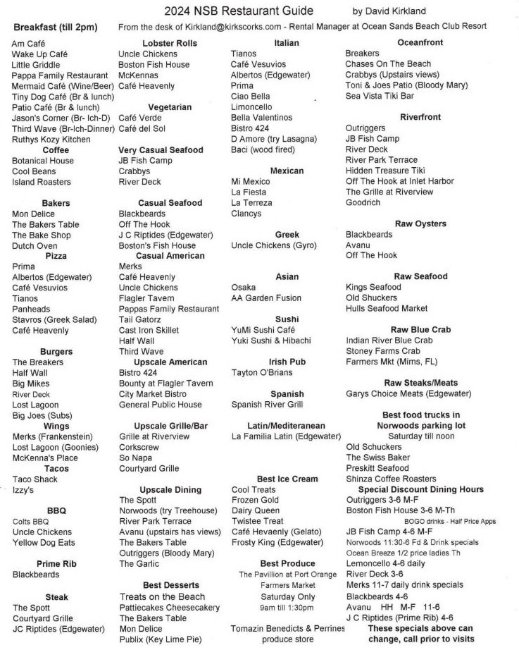 Cafes and Restaurants Local Cafes and Restaurants JB’s Fish Camp – http://jbsfishcamp.com The Crow’s Nest General Public House – NSB –https://www.generalpublichouse.com SoNapa Grille – http://www.sonapa.com Lemoncello South – Italian Dining – https://limoncellosouth.com/ Third Wave Cafe and Wine Bar – Brunch and Dinner – https://www.thirdwavensb.com/